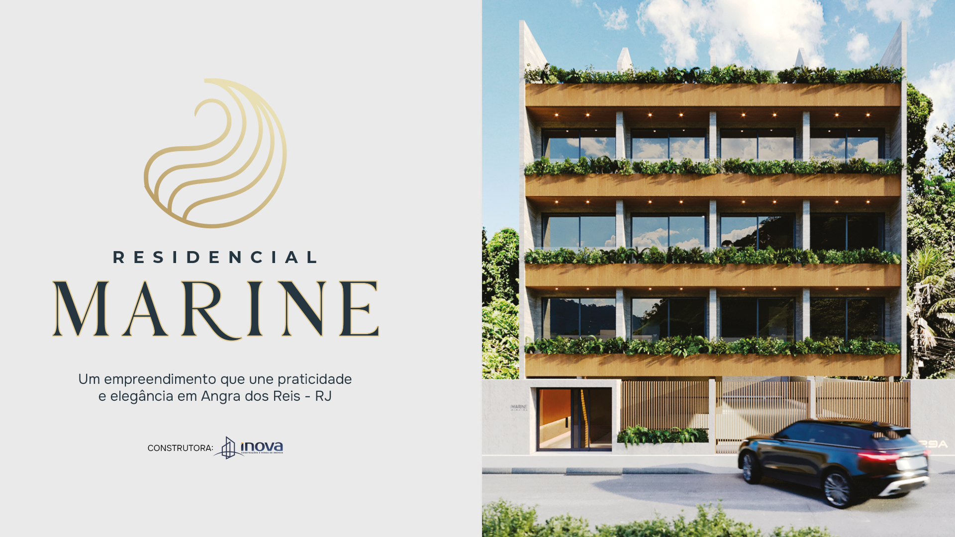 Inspirado na Arquitetura Contemporânea Brasileira, o Residencial Marine destaca-se por sua fachada elegante, que combina os tons amadeirados com o brutalismo do concreto. As jardineiras suspensas, inspiradas no verde exuberante da Mata Atlântica predominante na costa de Angra dos Reis, conferem leveza e sofisticação ao ambiente, tornando o projeto único na região.